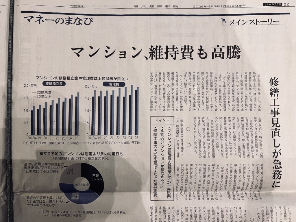 本日の日経新聞マンションの管理費・修繕積立金の記事が掲載されていました。