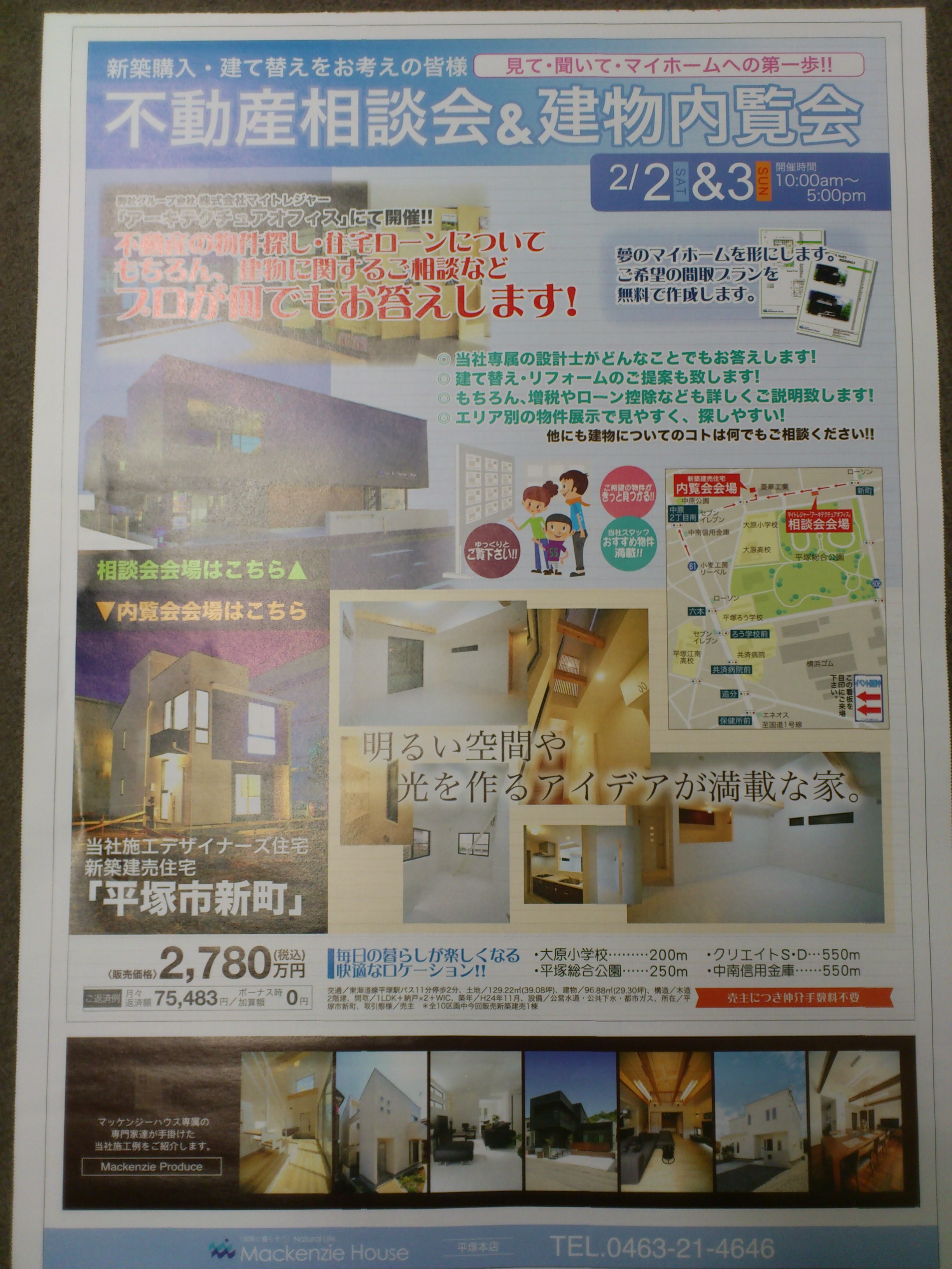HOME >平塚支店の不動産 >マッケンジーブログ【平塚支店】 >不動産相談会&建物内覧会開催のお知らせ。 不動産相談会&建物内覧会開催のお知らせ。 2013年1月31日 カテゴリー / 不動産ブログ 何時も当社のブログを御覧いただき、有難うございます。 今週の土曜日(2日)、日曜日(3日)10時~17時 当社アーキテクチュアオフィス(設計事務所)平塚市大原3番41号(湯乃蔵ガーデン、並び)にて不動産相談会を行います(内容:平塚市の不動産情報を土地、新築、中古戸建、マンション全1040物件を掲示板に張出、ご自由に 御覧に成れるように、張り出しています、後、売却相談や住宅ローンの相談も一緒にできます。) 同時に建物内覧会同時開催。 是非、お近くに来たらお立ち寄りください。 平塚支店のTOPに戻る 平塚市の不動産はお任せください MEMBER REGISTRATION 新規会員様大募集中! ★一般公開 / 1,475物件 ★会員限定 / 2,647物件 他社では見る事ができないマッケンジーハウス限定の プレミアム物件32件 どこよりも早く未公開物件や広告不可物件をご覧いただけます。会員登録は無料ですのでお気軽にご利用ください! 会員登録する ログインする 無料のプレミアム会員制度を導入しており、圧倒的な情報スピードでお客様にマッチングする物件情報がきっと見つかります MEMBER REGISTRATION 新規会員様大募集中! どこよりも早く未公開物件や広告不可物件をご覧いただけます。会員登録は無料ですのでお気軽にご利用ください! ★一般公開 / 1,475物件 ★会員限定 / 2,647物件 他社では見る事ができないマッケンジーハウス限定の プレミアム物件32件 会員登録する ログインする 無料のプレミアム会員制度を導入しており、圧倒的な情報スピードでお客様にマッチングする物件情報がきっと見つかります