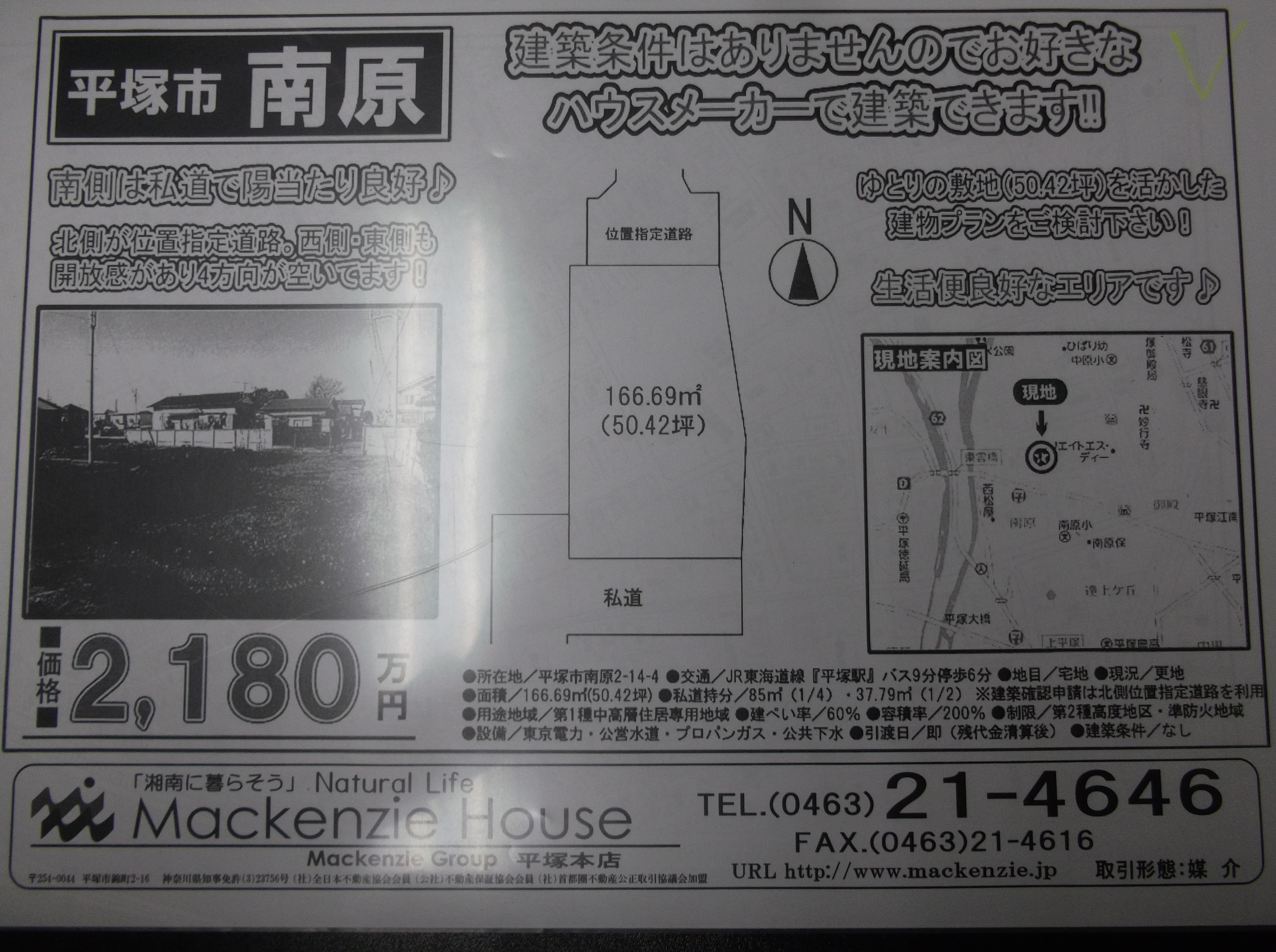本日の新着物件情報! 2015年2月14日 カテゴリー / 不動産ブログ 本日の新着物件は、平塚市南原の土地です。 50坪ございますので、ゆとりの建物がご計画できます。 更に南側私道の為日当たり良好です。 マッケンジーハウスでは、無料にてプラン図作成致します。 夢のマイホームのお手伝いを致します。 お気軽にお問合せ下さい。