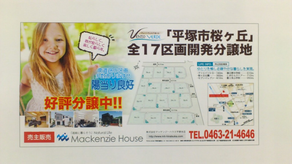 今日は暑かったですねぇ 現地にお越しいただいたお客様、ご来店いただいたお客様、 暑い中、本当にありがとうございました。 今までは販売予告という形で桜ケ丘の分譲地を広告に掲載しておりましたが、 次回の広告からもっと詳しい物 … 平塚市桜ケ丘 全17区画開発分譲地!!